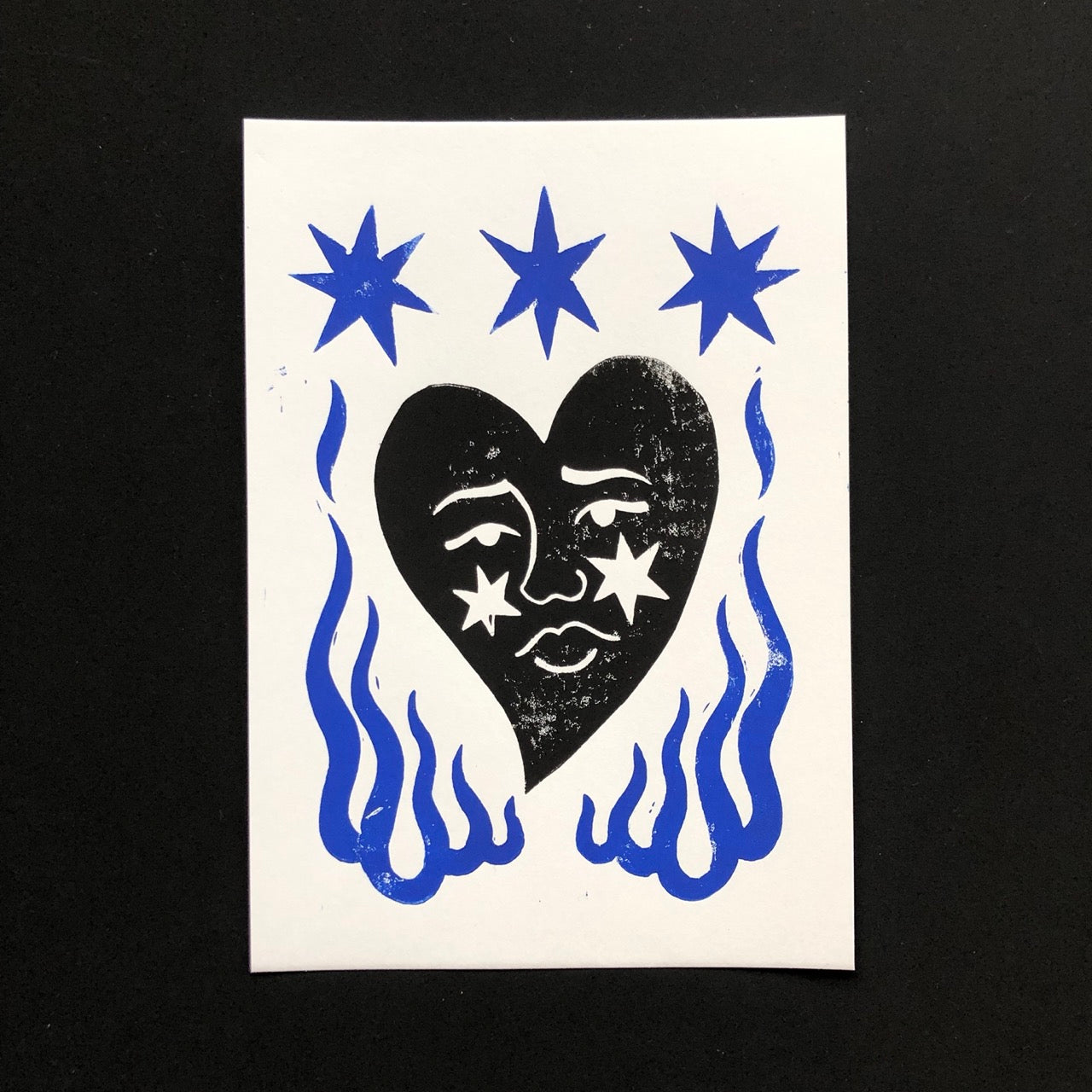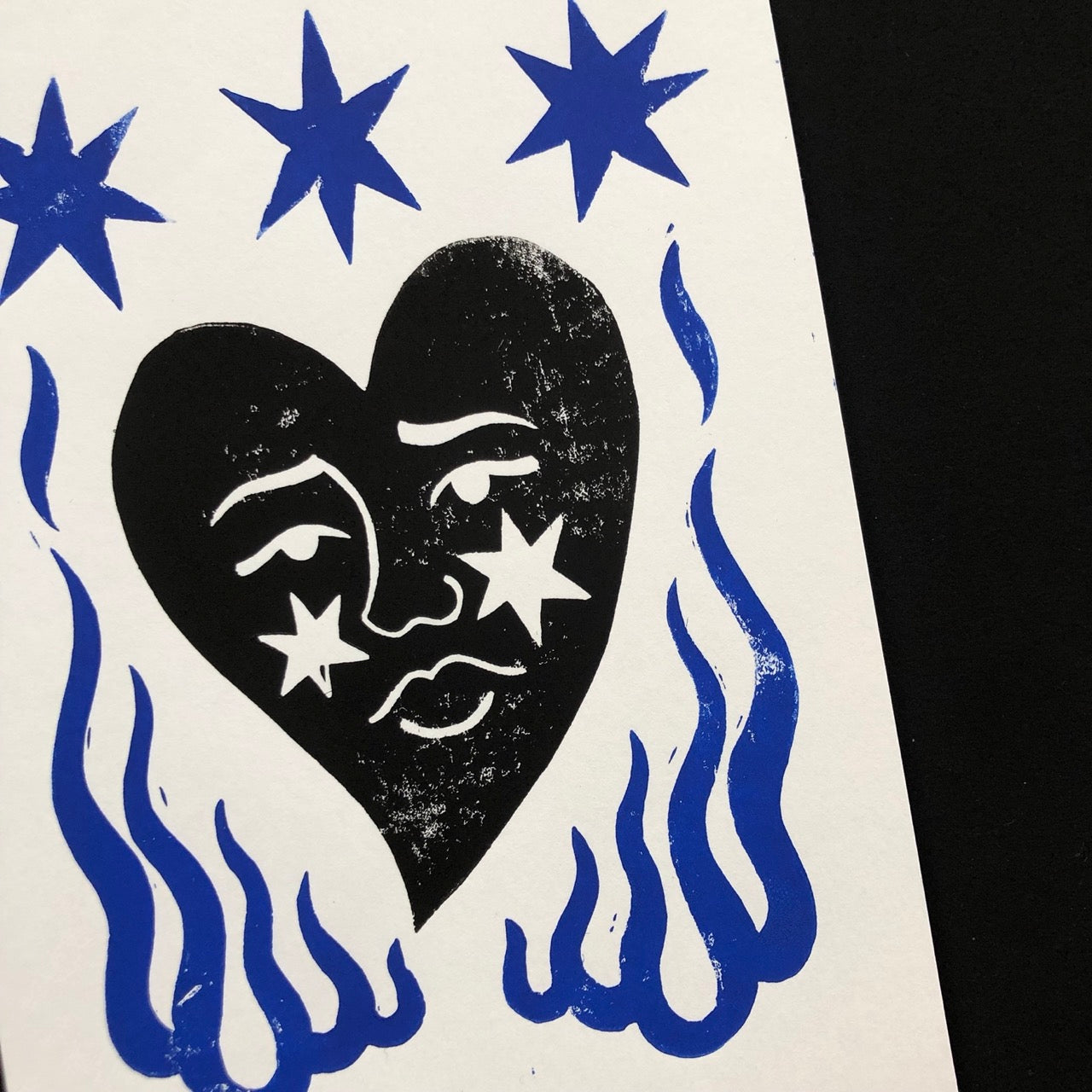 Linogravure bleue et noire, papier bristol 250gr