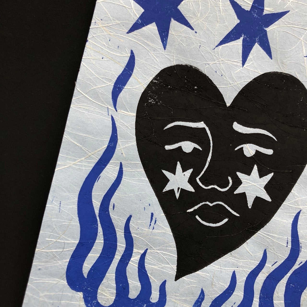 Linogravure bleue et noire, papier japonais bleu clair